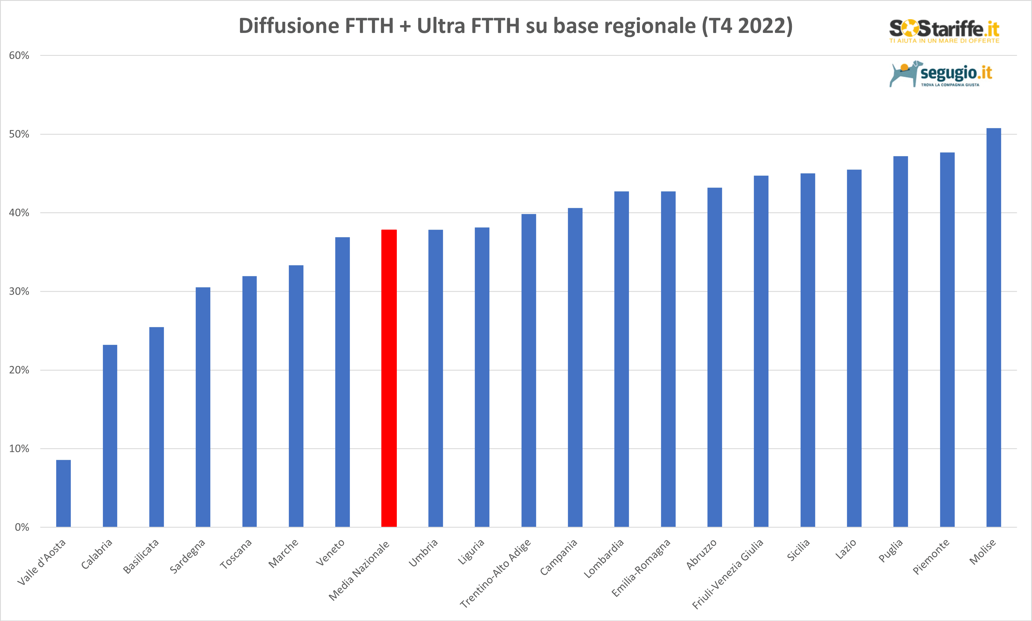 Dai dati raccolti dall’Osservatorio è possibile individuare quali sono le regioni italiane in cui la fibra ottica è più diffusa e in quali, invece, è più difficile poter attivare una connessione ad Internet con tecnologia FTTH. Considerando i dati del quarto trimestre del 2022, si nota come il Molise sia la regione italiana in cui la fibra ottica è più diffusa.